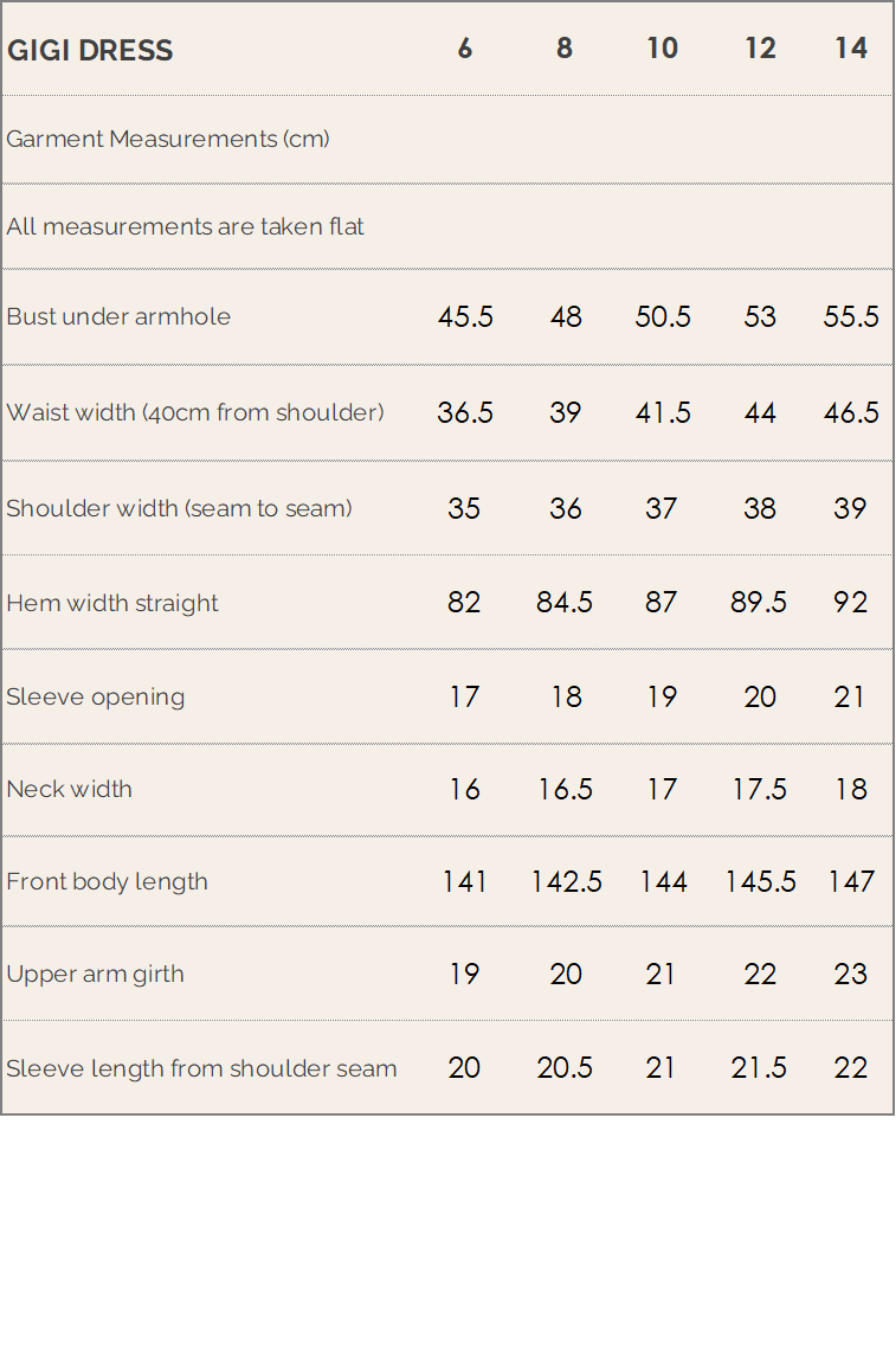 - Measurements are taken flat in centimetres.
